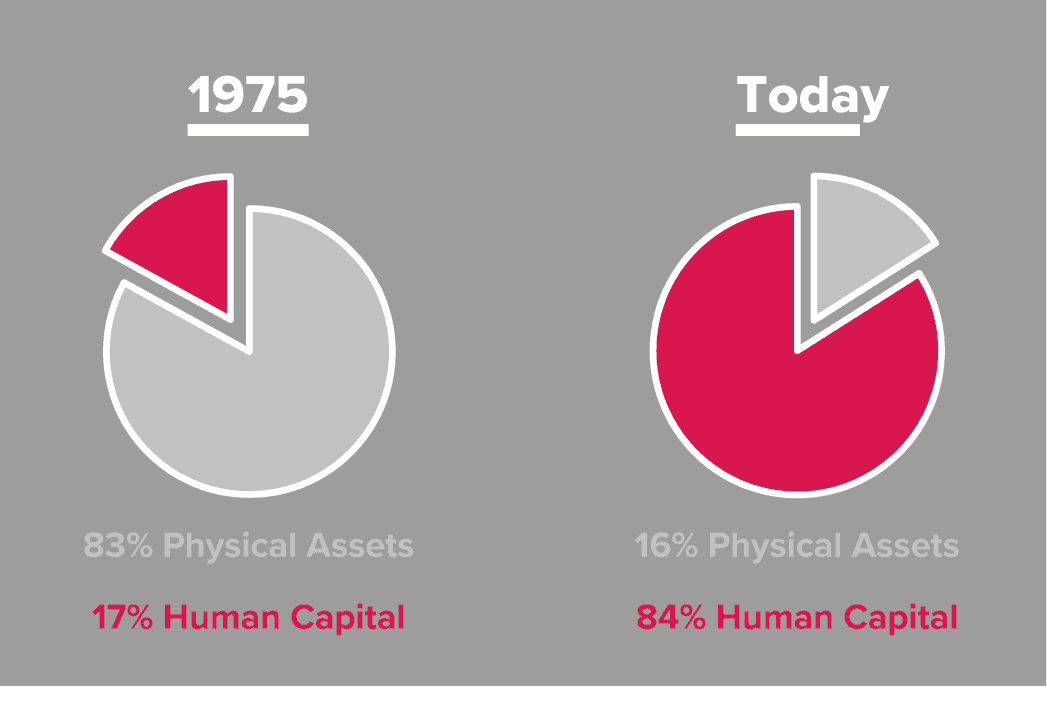 Up until the 1980s, the majority of publicly traded companies’ value was tied directly to their physical and tangible assets. But by 2015, only 16% of the value of S&P 500 companies could be explained by these metrics, while the remaining 84% was tied to human capital.