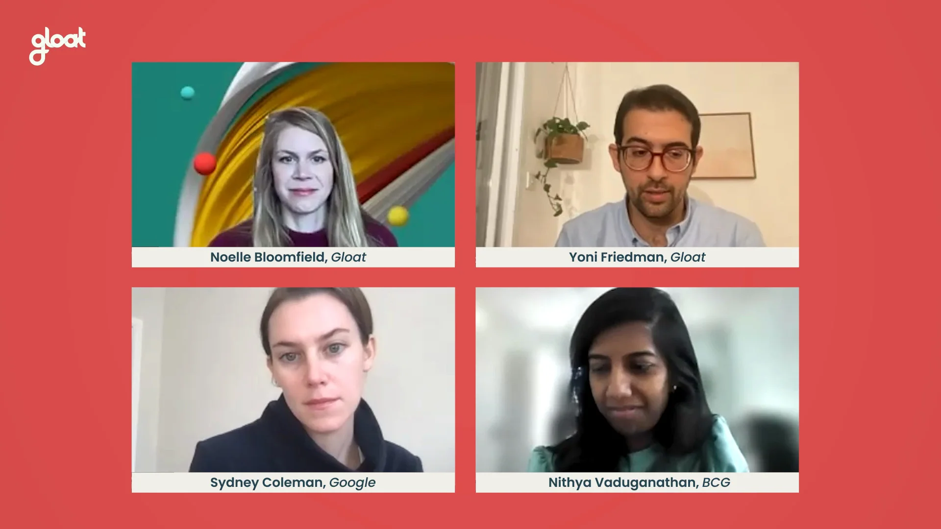 Sydney Coleman, Senior Product Inclusion & Equity Program Manager at Google; Nithya Vaduganathan, Managing Director and Partner at Boston Consulting Group; and Yoni Friedman, Gloat’s VP of Solutions Consulting tackled how AI can help companies create better work outcomes.